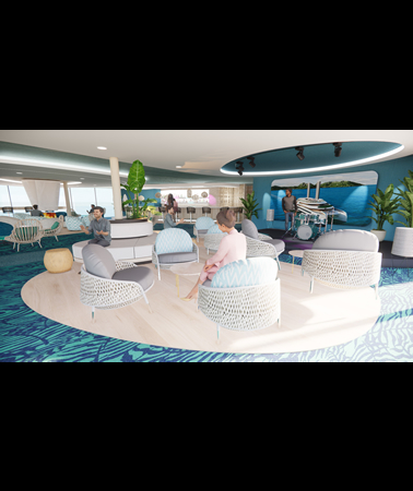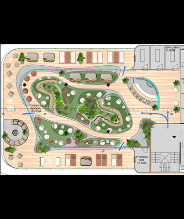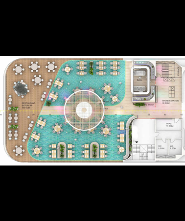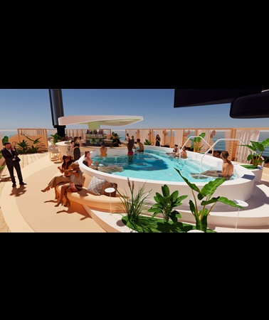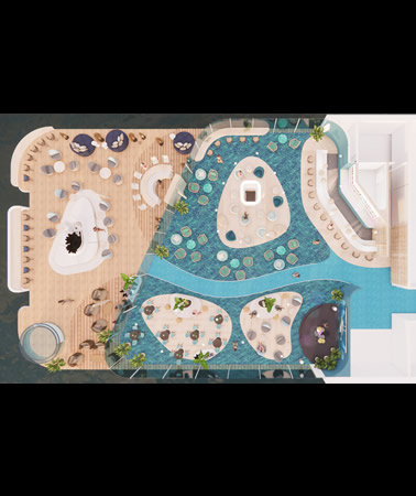 Our eco-friendly vessels use wing sail propulsion called Oceanwings® capable of creating forward thrust of 10-15knts, which is sufficient for daily cruising without the need for turning on main engines. Each ship will have alternative propulsion from Pod Propeller Systems along with Dynamic Positioning Systems eliminating the need for coral destroying anchors. L'esprit yachts will utilize the top deck as a sun platform for cabanas, a full service bar, and pool.