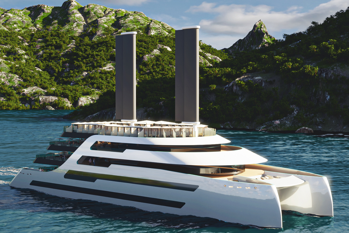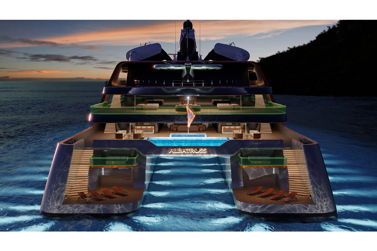The Albatross superyacht concept was designed by Lloyd Werft in collaboration with Stay Sea Design. This Epic 410-Footer (125m), christened ALBATROSS, Hybrid Catamaran Concept uses wing-like sails to harness the wind.